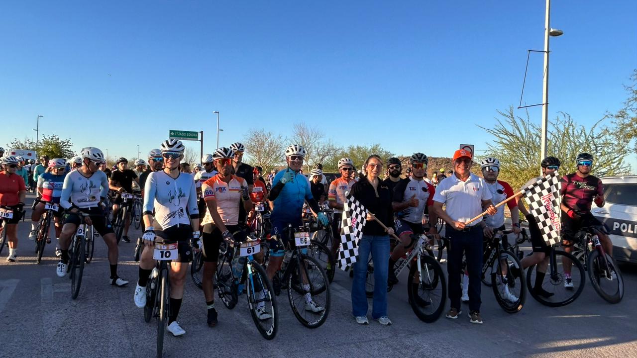 Hermosillo Sonora; 18 de octubre, 2025.-Más de 100 de ciclistas participaron en la 15vo Kino Race, en la que recorrieron 98 kilómetros desde el estadio Fernando Valenzuela, hasta la entrada de Bahía de Kino.
