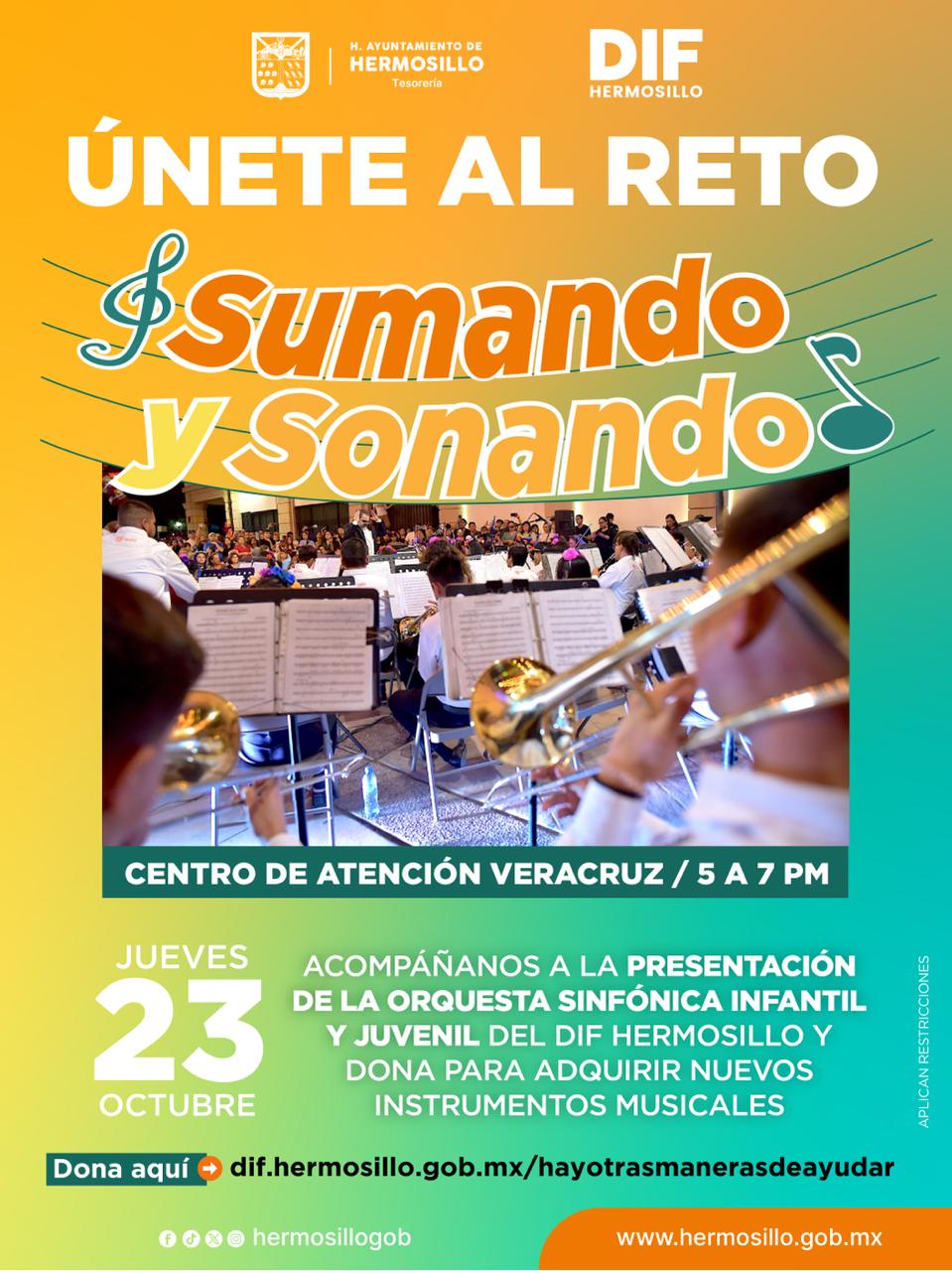 Hermosillo, Sonora; 22 de octubre de 2025.-Quedan pocos días para que las y los hermosillenses se sumen al reto "Sumando y Sonando", una iniciativa de Tesorería Municipal y DIF Hermosillo que combina el talento musical con la solidaridad, para dotar de nuevos instrumentos a la Orquesta Sinfónica Infantil y Juvenil.