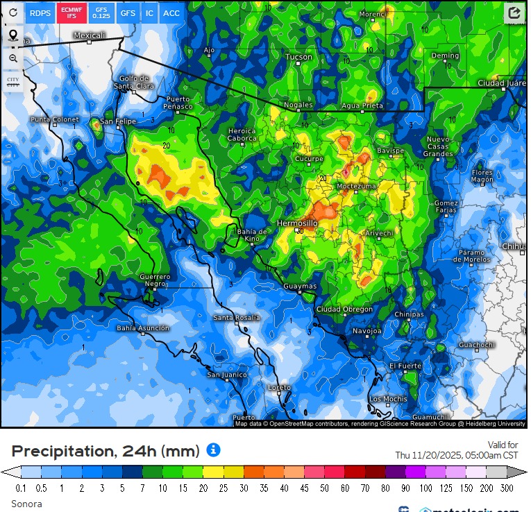 Hermosillo, Sonora; 18 de noviembre de 2025.- La Coordinación Estatal de Protección Civil (CEPC), informa del pronóstico de descenso de temperaturas y lluvias en la entidad, así como la posible caída de agua nieve y nieve en zonas montañosas durante esta semana.