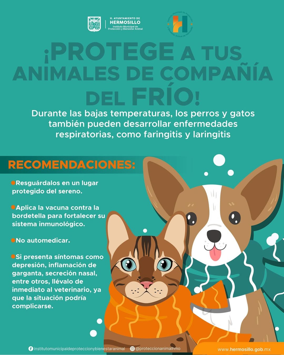 Hermosillo, Sonora, 31 de diciembre, 2025.-Un llamado a proteger a los animales de compañía durante la temporada invernal realizó el Instituto Municipal de Protección y Bienestar Animal, ya que pueden desarrollar enfermedades respiratorias.